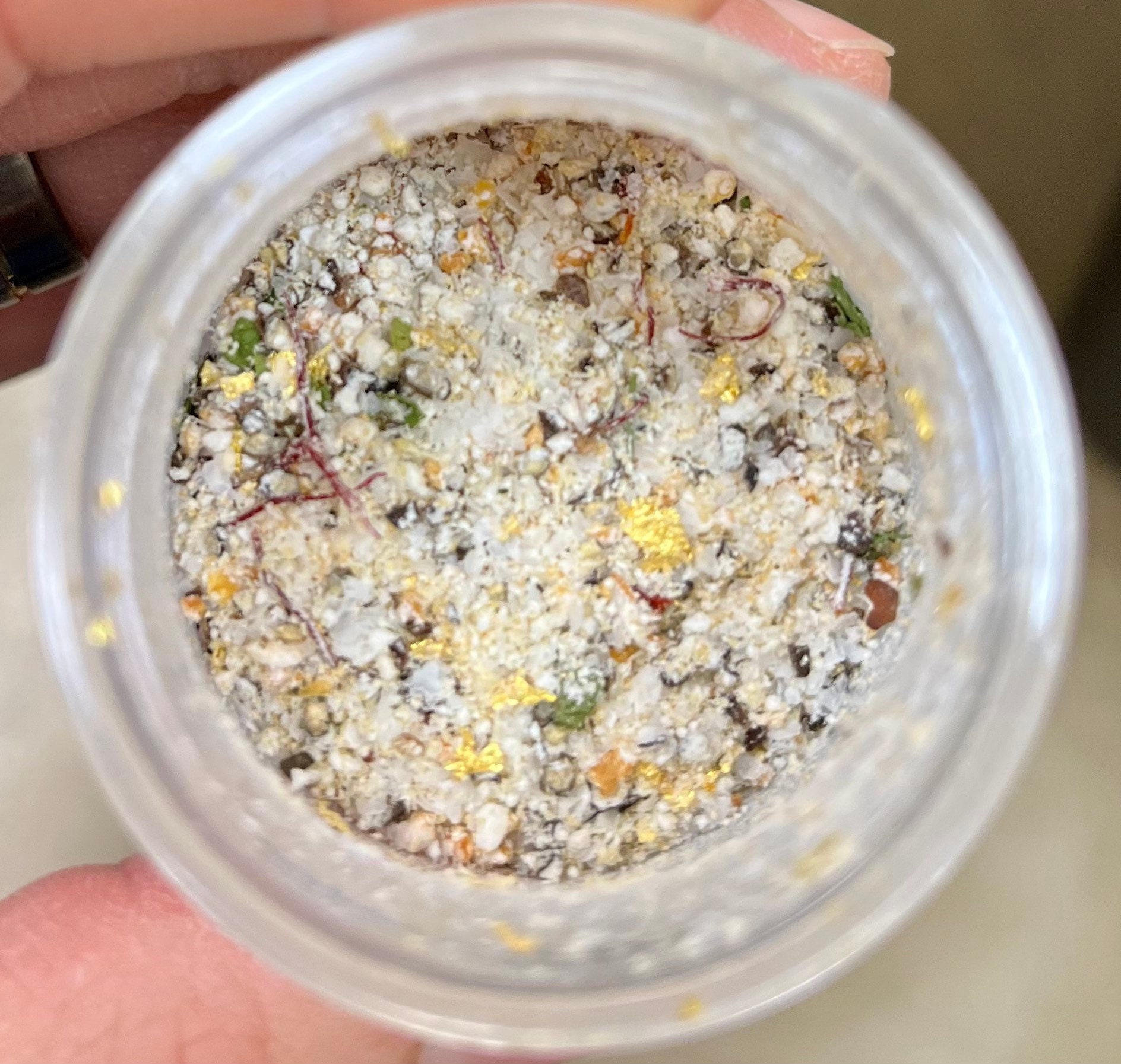 Ingredients: Kosher Salt, Garlic, Corn Starch, Onion, Spices, Safflower Oil, Saffron and 24kt Gold Flakes.