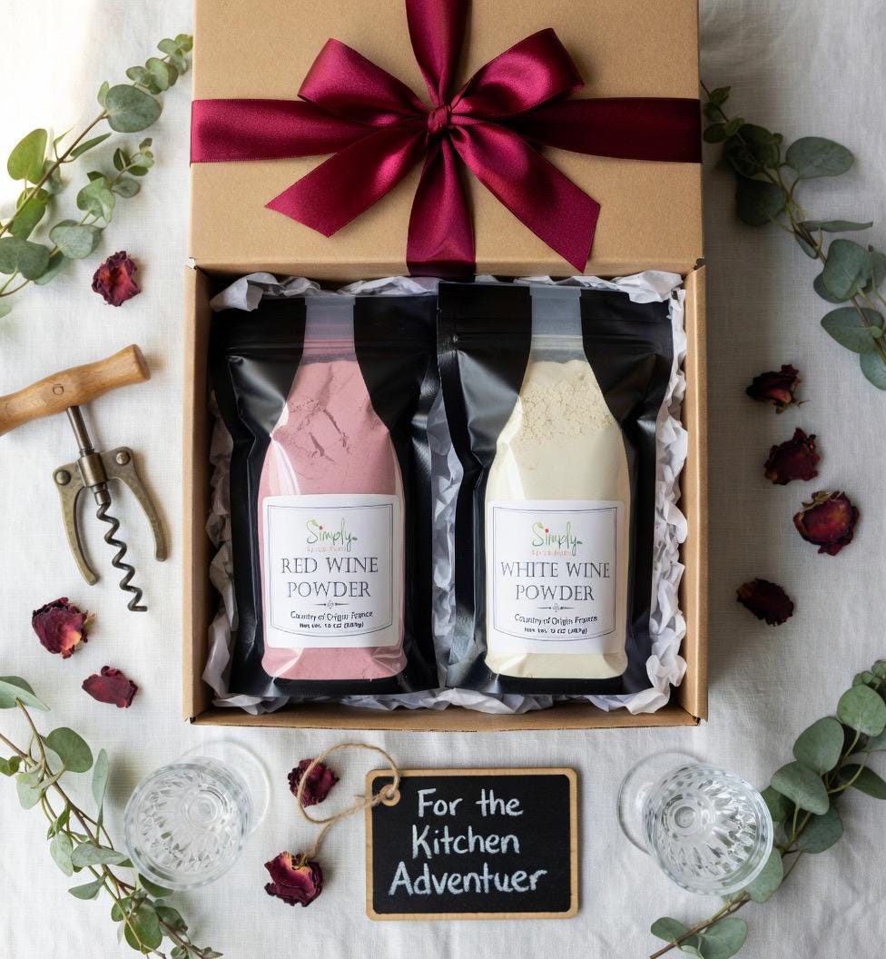 Ingredients: (Red Wine Powder) Red Wine* and Maltodextrin. (White Wine) White Wine Extract* and Maltodextrin. *Contains Sulphities.