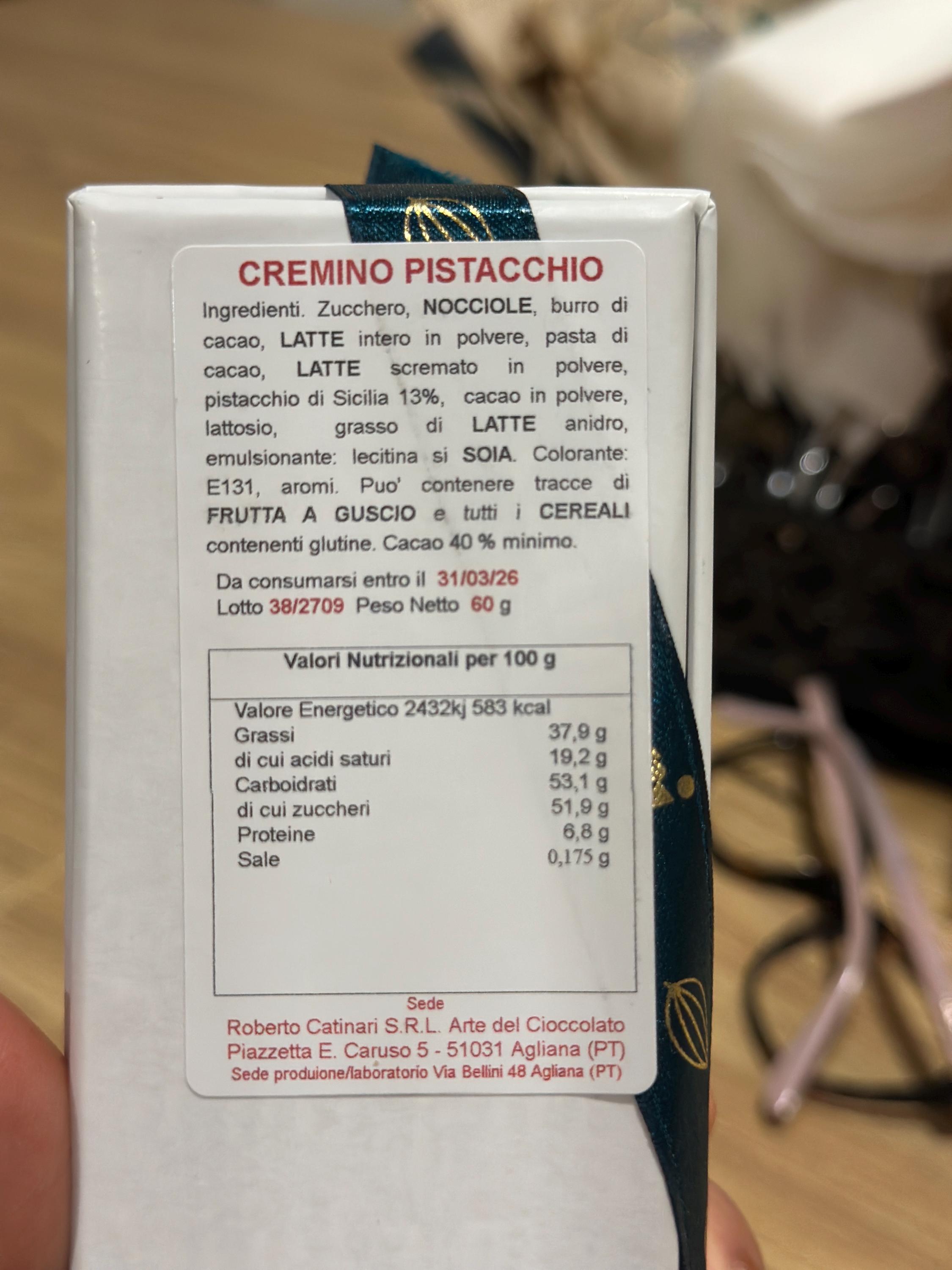 • Ingredients: Sugar, hazelnuts, cocoa butter, whole milk powder, cocoa paste, skim milk powder, pistachios (13%), cocoa (40% min), soy lecithin, natural vanilla.